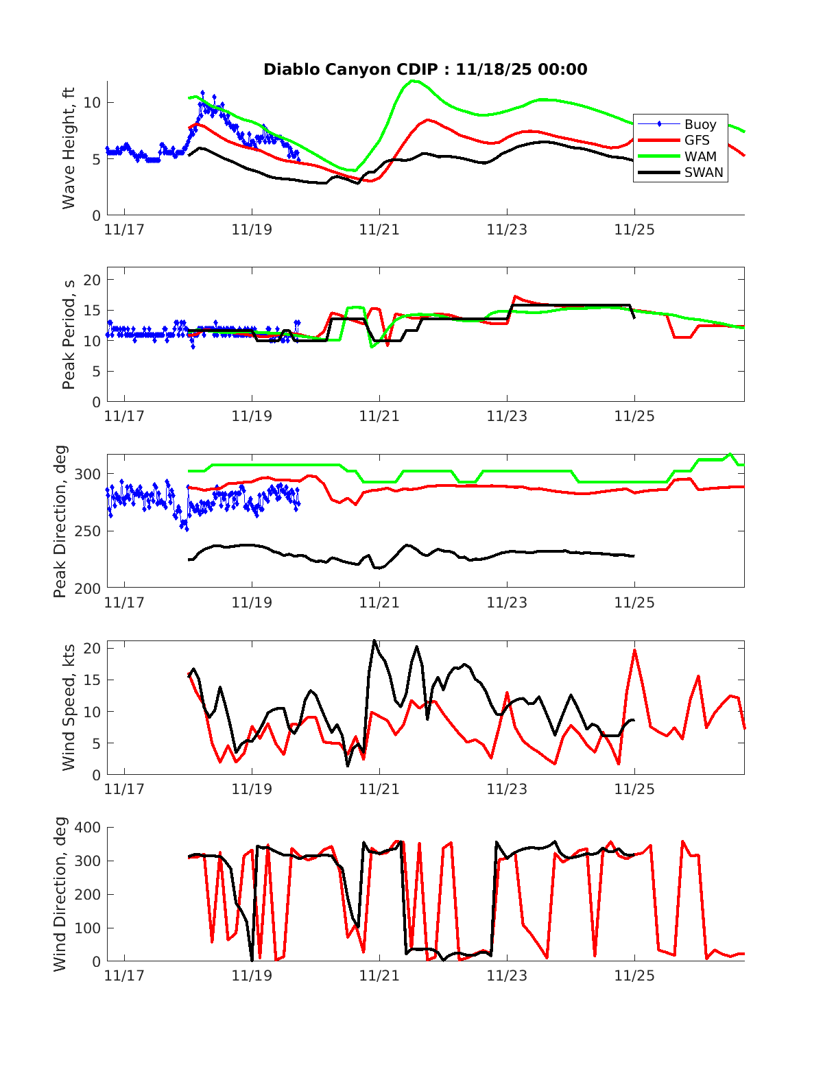 Diablo Canyon CDIP GFS Diablo Canyon CDIP MFWAM Diablo Canyon CDIP SWAN NDBC 46028 GFS NDBC 46028 MFWAM NDBC 46028 SWAN NDBC 46011 GFS NDBC 46011 MFWAM
