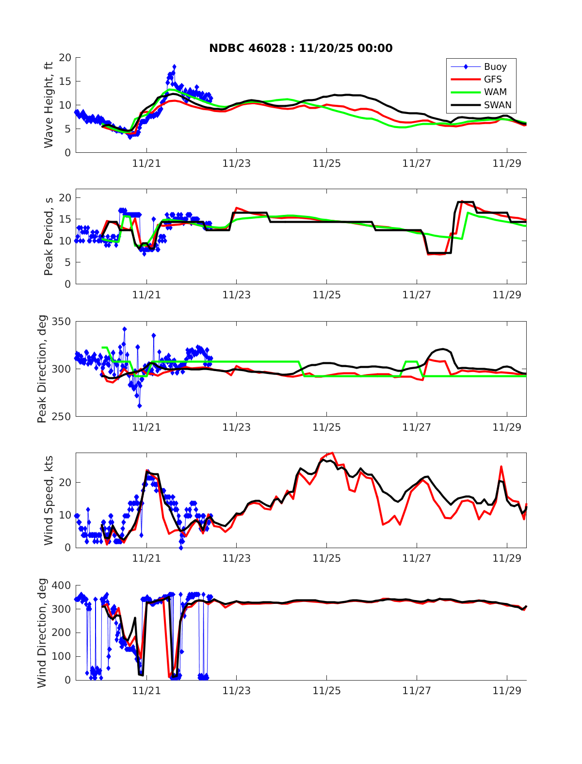 Diablo Canyon CDIP GFS Diablo Canyon CDIP MFWAM Diablo Canyon CDIP SWAN NDBC 46028 GFS NDBC 46028 MFWAM NDBC 46028 SWAN NDBC 46011 GFS NDBC 46011 MFWAM